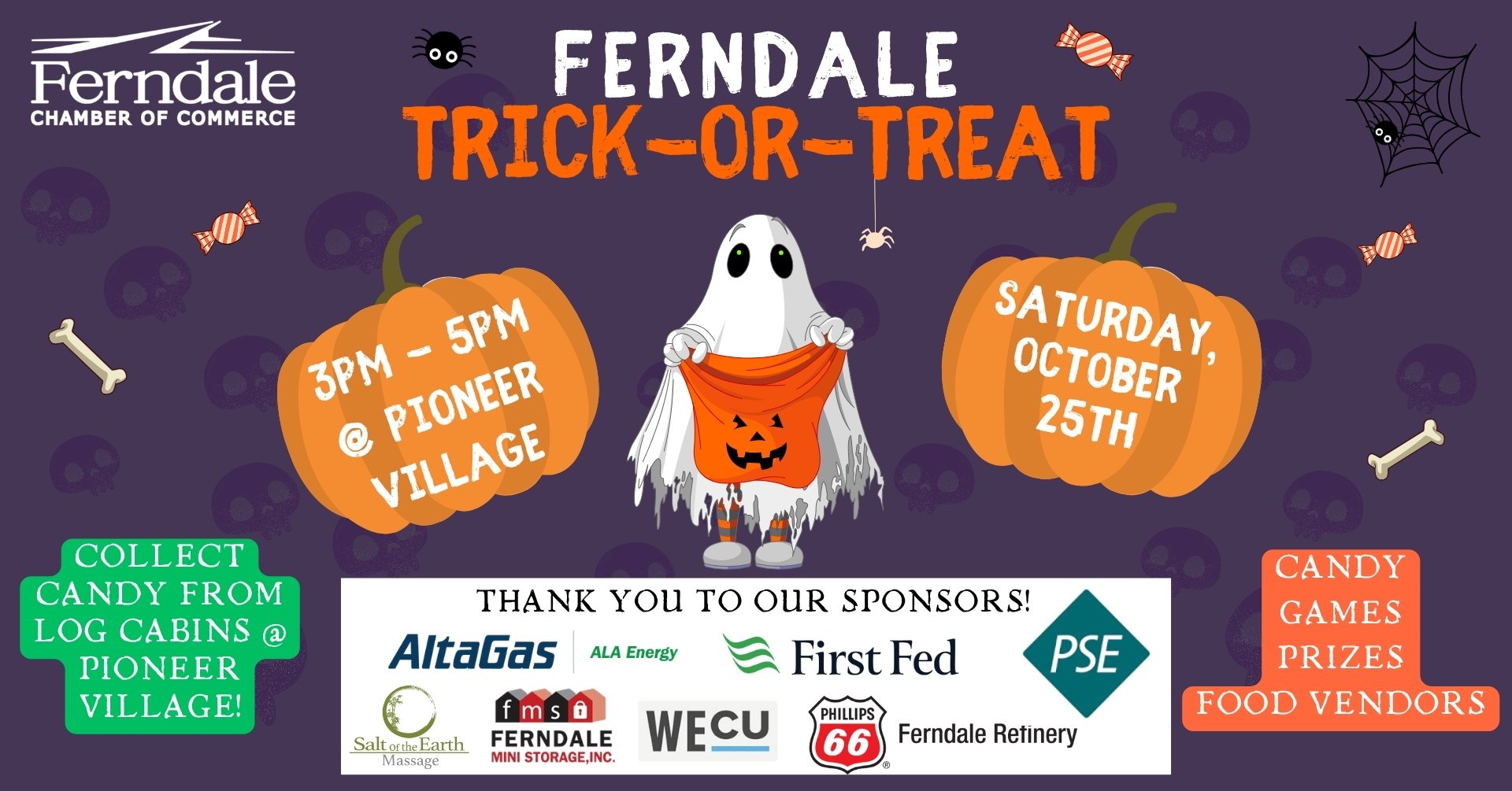 Ferndale Trick-or-Treat is back! Join us for the Ferndale Chamber's annual Halloween event on Saturday, October 25th from 3-5pm at Pioneer Village in Pioneer Park. Trick-or-Treaters can collect candy from businesses set up around Pioneer Village including the porches of historical log cabins for a fun and spooky experience.
